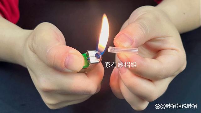 笔芯切下来后,我们将它拿在手上,然后用打火机把其中的一端烧一烧。笔芯是塑料的,燃烧后就会融化。