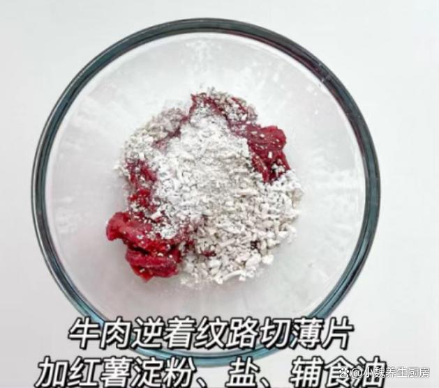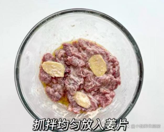 4:牛肉片放在器皿中,加上一个蛋清,加上葱姜水和料酒,加上生抽和蚝油半勺,调入生粉或淀粉半勺,用手迅速抓拌,让其上劲,放置20分钟左右。