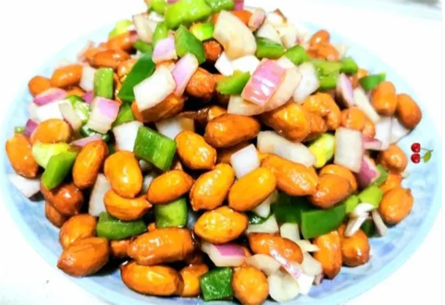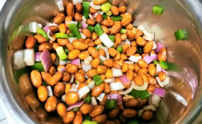 二、制作步骤: 1:炸制花生米 在锅中加入食用油,将生花生米小火炸制。炸制期间,要将花生米多次翻滚,确保均匀受热。 炸熟后,捞出并控油,将花生米倒入盘中。趁热时,加入半勺白酒,搅拌均匀,然后放置凉却。 2:准备其他配料 将洋葱和菜椒切成小块,备用。 3:制作调味料 取一个碗,加入半碗醋、1.5勺蚝油、1.5勺白糖,搅拌均匀,制成调味料。 4:混合成菜 将炸好的花生米、洋葱块和菜椒块一同倒入碗中。(www.ws46.cOm) 倒入调好的料汁,搅拌均匀,确保所有食材都均匀裹上酱汁。 5:装盘 将制作完成的老醋花生盛装到盘中,即可享用。