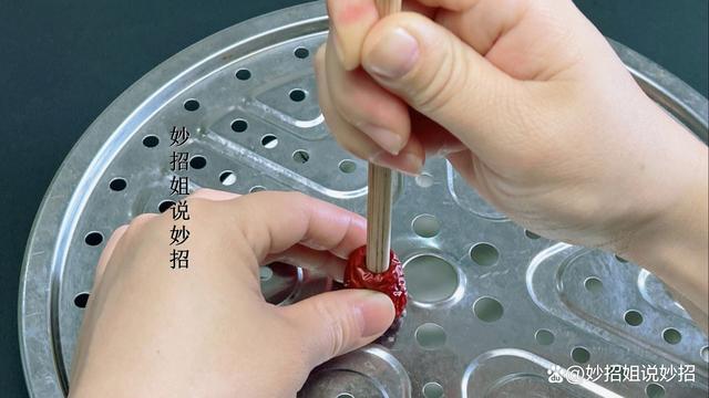 然后,用筷子的粗头对准红枣尾部的小黑点,用力向下捅一下。