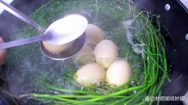 煮的时间差不多了,我们将锅盖打开,然后拿个勺子把鸡蛋逐个敲打一下。这一步的目的,是将鸡蛋壳敲破,可以使煮出来的荠菜水充分的浸润到鸡蛋,鸡蛋也就更入味了。