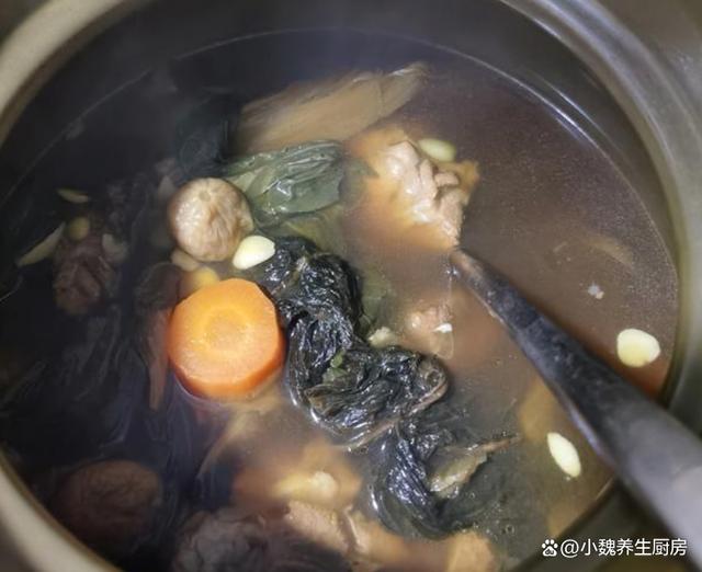 5:准备好一个炖锅,锅中放入焯水好的猪骨,放入胡萝卜,菜干,黄豆,蜜枣,陈皮,处理好的猪骨和其他食材,加上足量纯净水,这样炖出来的汤汁更甜美。 6:开大火炖煮20分钟,调至小火焖煮,一定要掌握好炖汤的火候,汤汁煮出香味,调入一丢丢胡椒粉和食盐,关火即可,这款菜干胡萝卜黄豆炖猪骨汤就可以食用了。菜干胡萝卜黄豆炖猪骨汤是一道非常鲜美的广东传统名菜,主要用猪骨、黄豆、胡萝卜和菜干,经过烹调后,汤汁浓郁,味道鲜美,具有滋补身体、润肺化痰、活血通络等功效。此汤十分鲜美,营养很出色,暖身暖胃,促进营养的消化,还可以增强身体的抵抗力,让你今年少生病。
