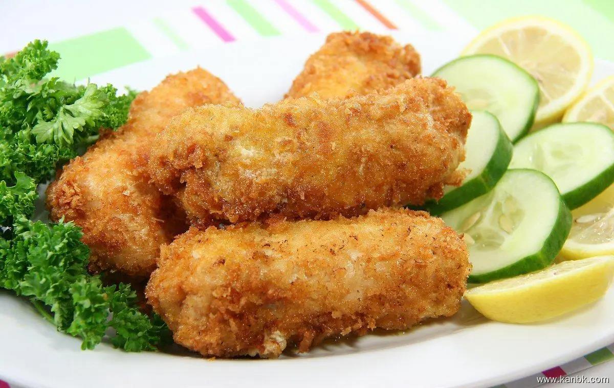 将裹好面包屑的鸡肉块放入油锅中,轻轻炸制大约8-10分钟,直到鸡肉变成金黄色并且熟透。