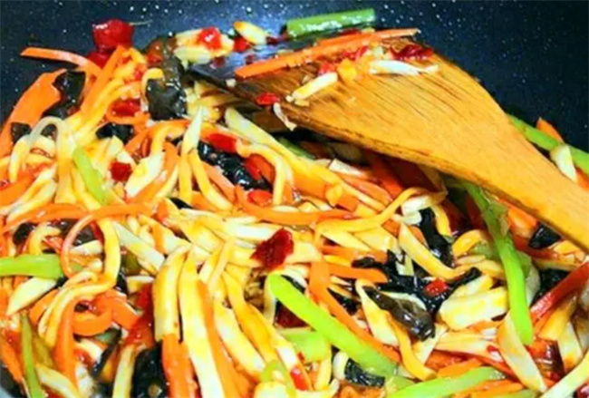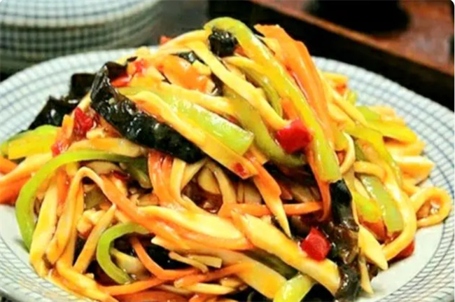 三、制作步骤: 1. 将需要的蔬菜和食材切成丝状,包括杏鲍菇、胡萝卜、青椒、木耳,同时将葱、姜、蒜切末备用。 2. 取一个小碗,将半勺淀粉、适量的盐、两勺生抽、一勺糖、两勺醋,再加入适量的清水,搅拌均匀,制成碗汁备用。 3. 在锅中加入食用油,加热后加入一勺豆瓣酱,煸炒出红油,加入葱姜蒜煸炒至散发香味。 4. 接着,依次加入杏鲍菇和胡萝卜丝,翻炒一分钟。 5. 将木耳加入锅中,继续翻炒两分钟。 6. 加入青椒丝,翻炒30秒。 7. 倒入事先准备好的碗汁,烧开后搅拌均匀,使菜肴汤汁变得浓稠,然后即可装盘。