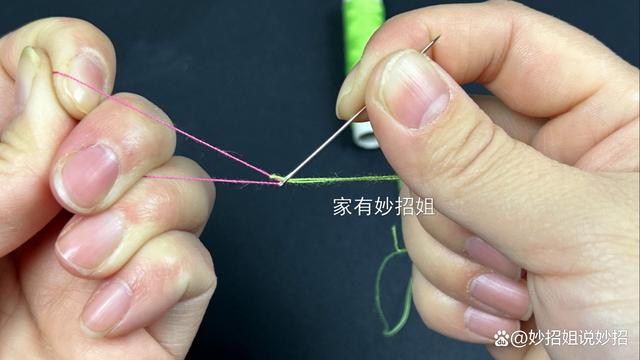 接下来,我们再一手将两边的旧线头都抓起来,而另一只手则抓住针和新线。最后,只需要慢慢的拉扯旧线头,在这个过程中,搭在旧线头上的新线也会随着旧线头一起拉动,然后慢慢被拉进针眼。