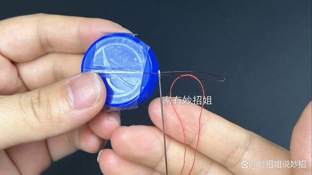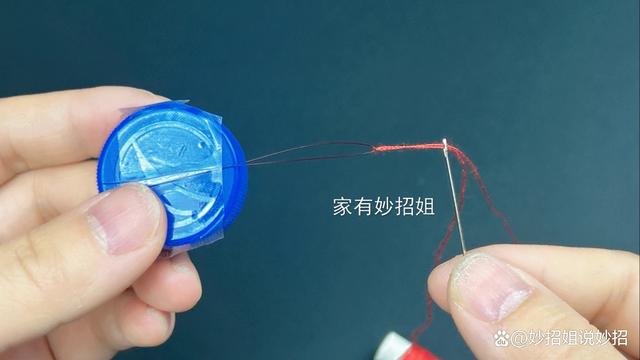 接下来,我们再抓住瓶盖将扫把丝往回拉,这样线就被带出了针眼,我们的线也就穿好了,非常的简单。这个用瓶盖制作好的穿针工具好用又快速,而且用完将它放在针线盒里,下次要穿针时又可以继续使用。