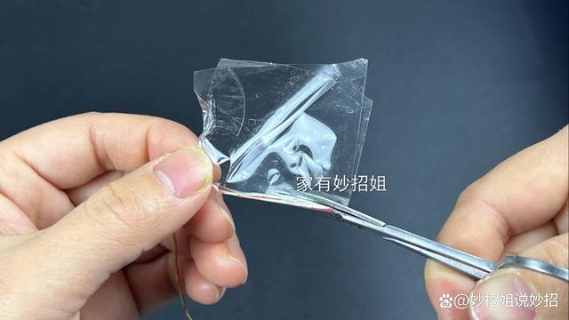 妙招三:胶带法。 先取一小段的透明胶带,将胶带粘的一面朝上,然后再将要穿的新线拉长一点,把它粘在胶带靠中间一点的位置。