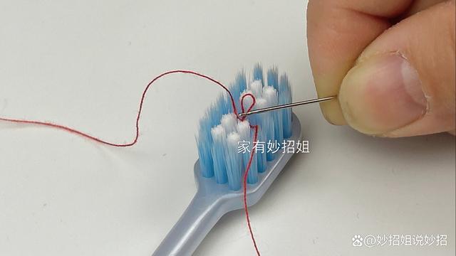 妙招四:牙刷法。 平时用来刷牙的牙刷,也可以用来帮助穿针引线。只需要拿把牙刷,把牙刷刷毛朝上的放置在桌面上,然后将要穿的新线随意搭在刷毛上。接着,我们再用针眼对准线,然后稍微用力往下按压一下,这样搭在牙刷上的线就被挤出了针眼。这是因为,牙刷的刷毛非常细小,针眼里面都可以一次性穿过几根刷毛,我们将线搭在了刷毛上面,在按压的过程中,刷毛上的线,就会连同刷毛一起被穿过了针眼,刷毛就起到了一个支撑的作用。如果今天的文章对您有帮助,那就点一个关注,点一个赞,感谢您的支持。