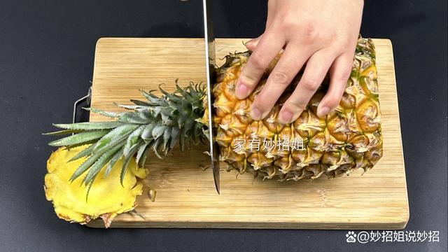 切好后,我们再把菠萝从中间对半切开,然后取其中的半个菠萝倒扣在菜板上。