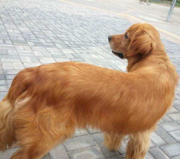 3. 头部也是一个判别点。纯种金毛的头部宽大,嘴巴也很大,在头顶部稍后的位置有骨骼突出来。还有就是从鼻子中心点有一条纵直直的沟。深沟比浅是要好些的。 4. 纯种金毛的毛发颜色有金色黑色白色浅黄色。可以根据自己的喜好来选择。但是最好也是人们选择最多的是金色。纯种金毛毛发也是越多越长越好。尾巴和背部的毛发平行有很多边毛。