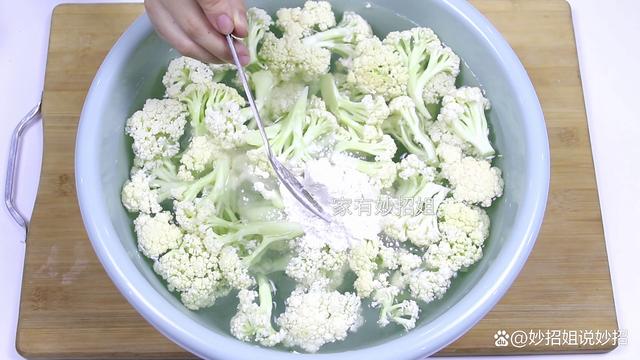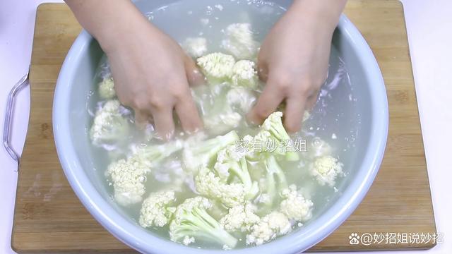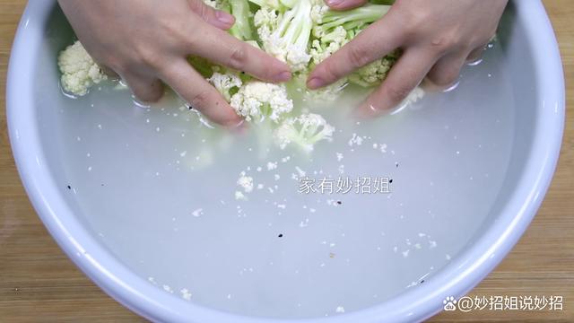 接着,往里面加入没过花菜的清水,然后用手搅拌一下,使食盐和面粉都充分的溶解在水中。食盐具有杀菌的作用,可以有助于将隐藏在花菜中的细菌、虫卵给清洗出来。而面粉则具有吸附功效,就算是花菜缝隙中的脏东西,也能轻松吸附到水中。搅拌好,我们就这样让花菜在这个水中浸泡上5~6分钟。