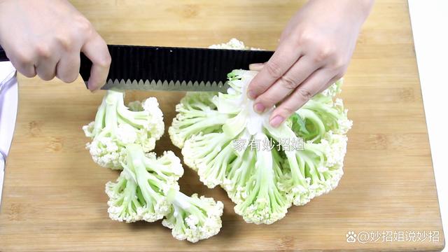 但如果有些根茎比较大,导致上面的花朵也大的话,我们再顺着根茎上的小分叉,将它再切一刀,这样花菜就切成自己想要的大小了,方法简单快速,花菜不散也不掉渣。