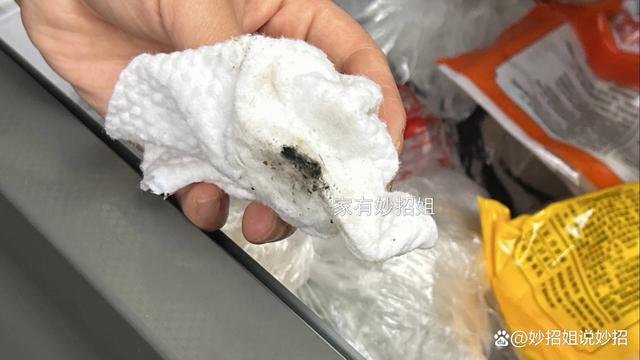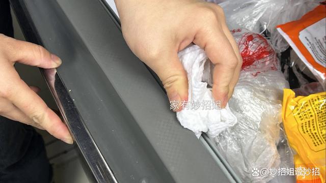 充电头的这个金属插头就能很好的插入胶条的缝隙当中,经过来回的擦拭我们就可以看到,胶条已经被清洁干净了,而棉柔巾则明显变黑了。建议大家经常的要将胶条清洁一下,这样才能保持冰箱的卫生。