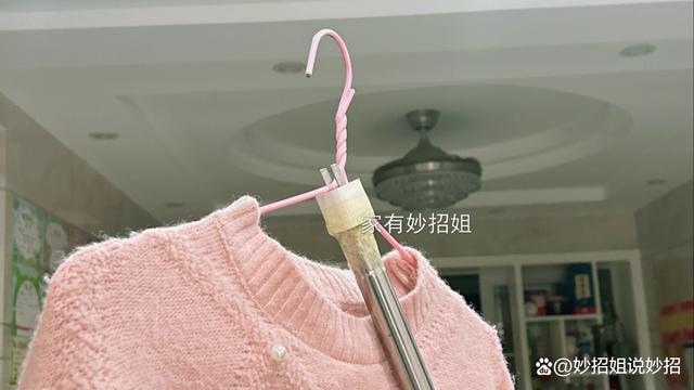 胶带绑好后,那么这样一个撑衣架就改造完成了,用来撑高处的衣服非常方便。要是家里没有撑衣架,或者撑衣架刚好坏掉的情况下,你也可以利用废旧的充电头改造一个。