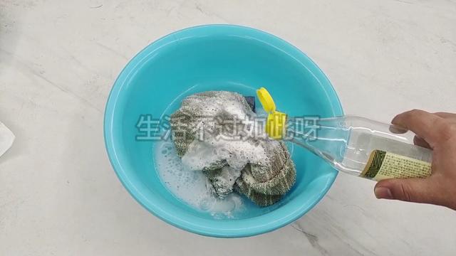 接下来,将适量的白醋倒入盆中,白醋能软化毛巾纤维和去除污渍。