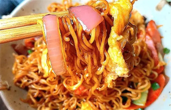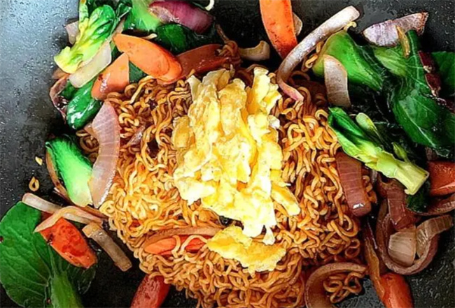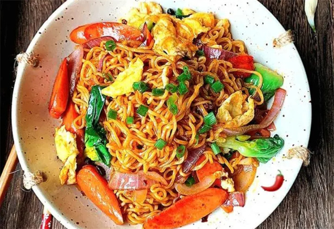 二、炒方便面的做法步骤: 1:准备食材 首先,将洋葱切丝,火腿肠切片,将青菜洗净,将鸡蛋打散,小葱切末,为炒方便面做好食材准备。 2:煮方便面 在一锅中烧开水,待水沸腾后加入方便面饼,但不要将其煮熟,只需煮至面饼散开即可。然后,将面饼捞出,过冷水并沥干水分。 3:炒鸡蛋 将鸡蛋炒散,盛出备用。 4:炒食材 将火腿肠和洋葱稍微炒熟。 5:加入青菜、泡面和调味料 接下来,将切好的青菜、泡面和鸡蛋一同加入锅中。倒入半勺老抽、半勺蚝油、一勺老干妈,然后适量的盐和鸡精。翻炒约半分钟,确保所有食材充分混合均匀。 6:享受美味 现在,可以享受炒方便面的美味了!这种独特的吃法为您带来口感更加丰富的方便面体验,并增加了蔬菜和其他配料,提供更多纤维、维生素、矿物质、蛋白质和其他营养物质。这美味,还更加营养丰富,满足了我们对美食和健康的需求。