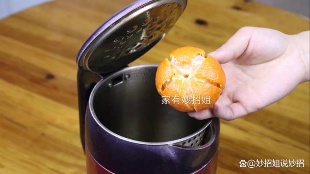 白醋倒好,我们再准备一些新鲜的橘子皮,把橘子皮也放入电热水壶中,家里如果没有橘皮,用柠檬代替效果也是一样的。