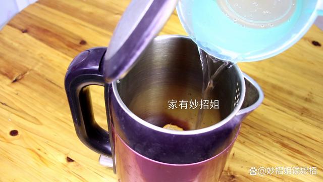 接着,我们再往里面倒入清水,水不需要太多,大概有半壶水的样子就可以了。水倒好我们再把水壶盖子盖上并给它通上电,让它自动烧开。