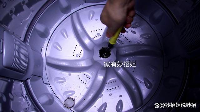 将洗衣机里的过滤网清洗干净后,第二步,我们就需要将底座给它清洗一下了。可以看到在洗衣机底座的中间有一个凸起的部位,而凸起部位的中间又有着一块圆形的塑料片,我们用剪刀或小刀的尖头对准边缘处撬一下。