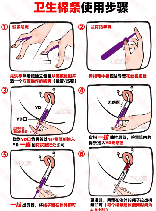 卫生棉条详细使用步骤先洗手,然后把独立包装从贴纸处撕开,选一个方便操作的姿势(坐着/站着) 拇指和中指捏住导管花纹握把处 找到YD口将导管以45°角倾斜推入YD推到花纹握把处即可 食指一按助推导管,将导管内的棉条推入YD无感区 拉出导管,将绳子留在体外即可 更换时,用留在体外的绳子拉出棉条即可(每个棉条建议使用时间为4-8小时)