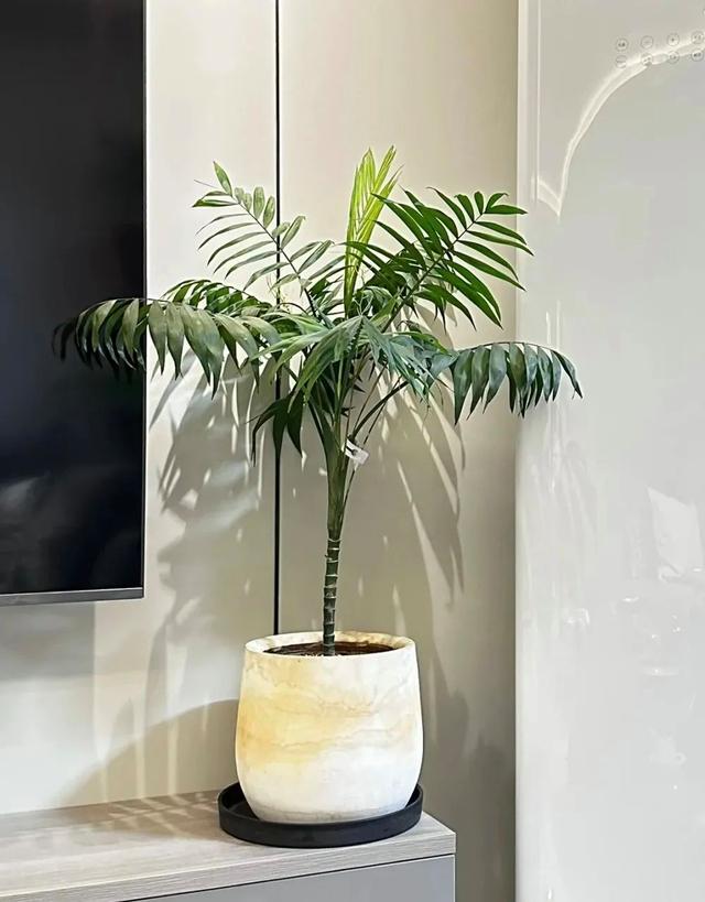 龟背竹是健康和长寿的代表花,它的叶片非常巨大,十分厚实,绿的发光,触感也非常有趣,整体造型又贵气又有活力,放在家里的客厅里是不错的绿色植物,能给环境增添一抹氛围感。龟背竹对水分的需求量较高大概每周浇水2到3次左右,不然缺水容易导致叶片发软发黄。另外,龟背竹的蒸腾性很强,多喷水,很对整体育也很有利 袖珍椰子