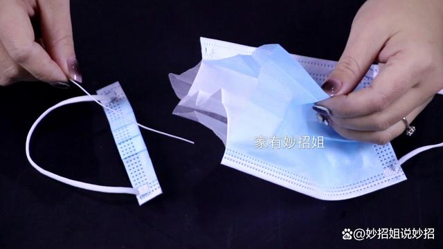 方法很简单,首先我们需要准备一个一次性的口罩,然后用剪刀将口罩的一端剪下来。这个一次性的口罩通常都是有三层材料构成的,剪开后,这三层材料就会分开,我们只需要扯开其中的一层,这样口罩就变成了一个口袋的样子。在口罩的其中一边,还会有一个细小的钢丝条,我们在钢丝条的一端剪开一个小口,把这个钢丝条给它抽出来放一边备用,这样口罩就改造好了。