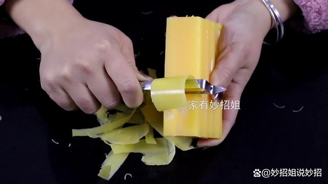 接着,我们还需要准备一块肥皂,就是平时我们用来洗衣服的肥皂就可以。肥皂准备好,我们再拿把削皮器,然后一手抓住肥皂,一手拿着削皮器,用削皮器在肥皂的表面刮一刮,这样就会有很多的肥皂片给刮下来。如果身边没有刮皮器的话,我们也可以用小刀来切,效果也是一样的。不过我们要注意的是,不管是小刀还是削皮器,都不要伤到手了。