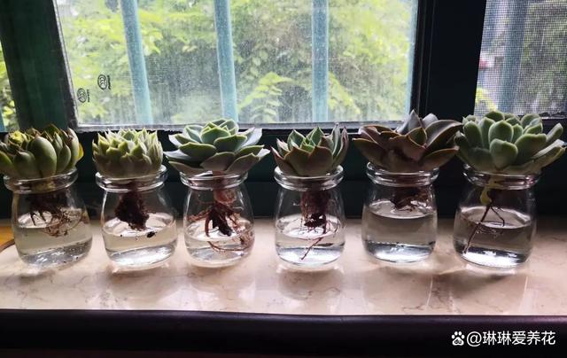 水培多肉最大的好处就是干净卫生,不需要去摆弄花土,家里没有任何的灰尘,其次是还可以减少土壤的费用,从网上买几个透明的玻璃水瓶,买回家装上水就可以用来栽培多肉,放在阳台上必须要满足充足的光照,否则是会徒长的。