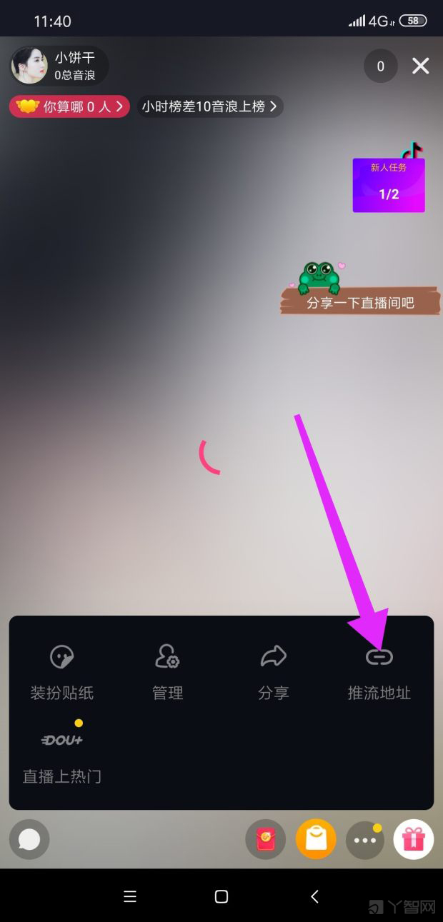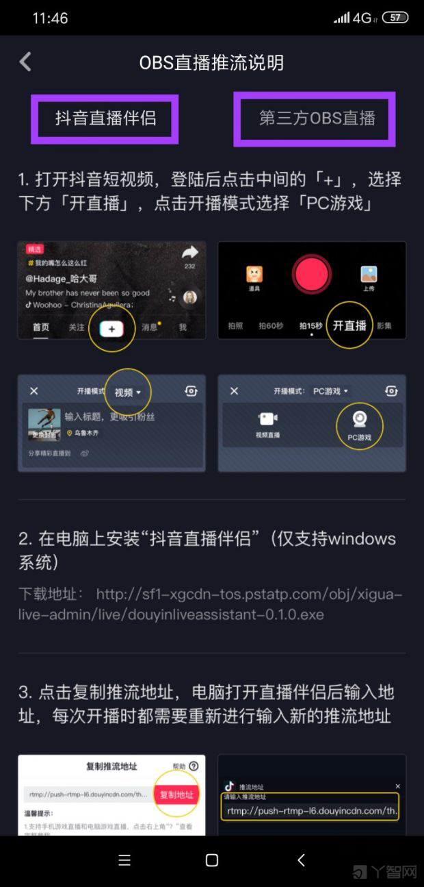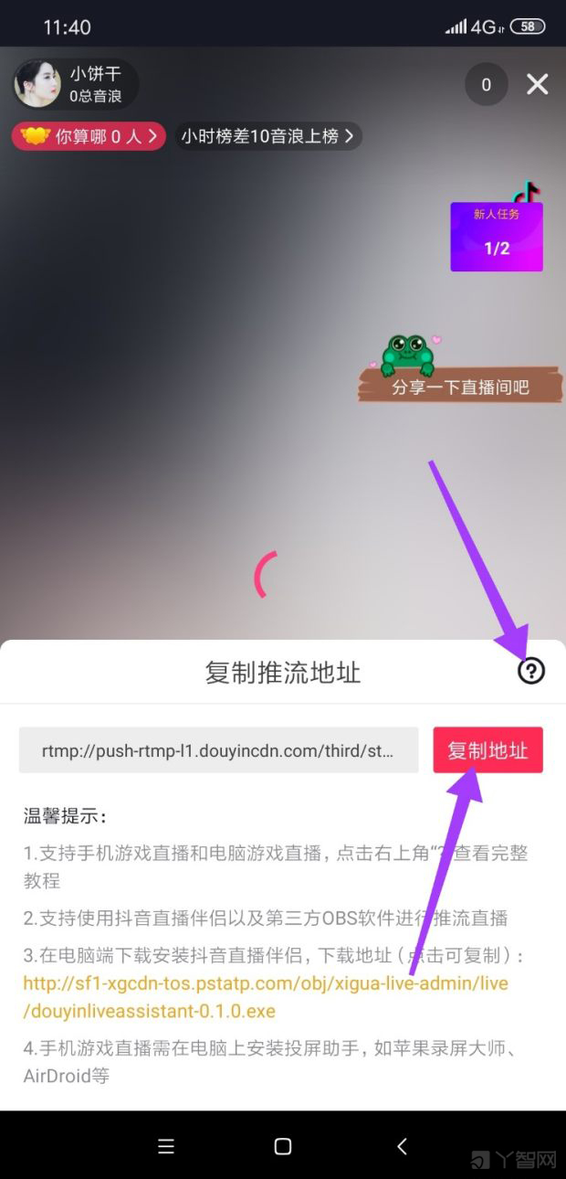 4.推流操作说明 点击推流地址右上角的“ ? ”,查看完整教程; 可选择抖音直播伴侣或第三方OBS直播推流,详细操作流程见说明;
