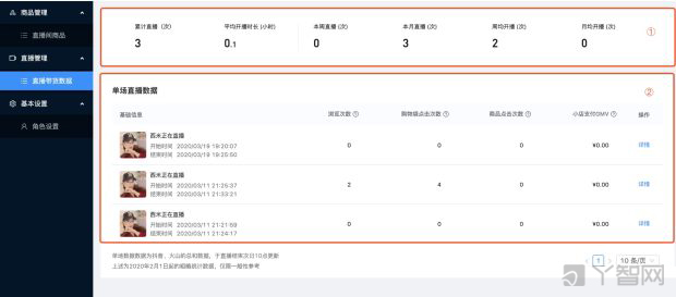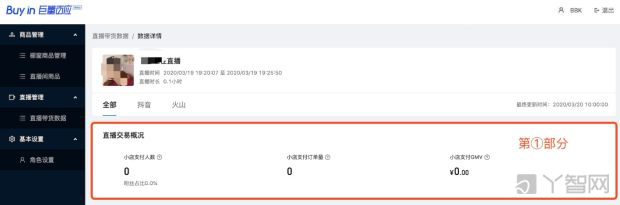 点击[数据详情]可跳转单场直播间数据明细页 ·第①部分:直播交易概况(暂时支持小店数据)