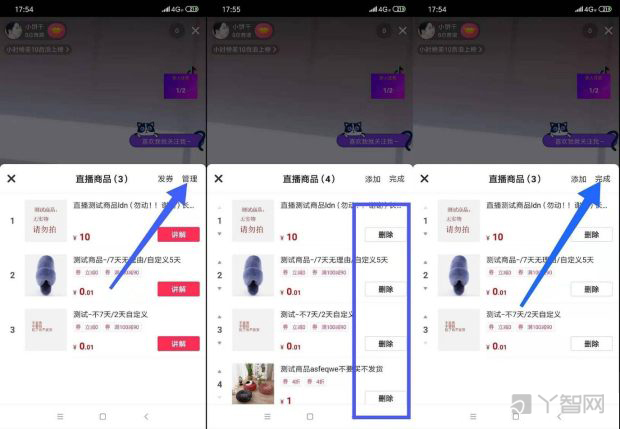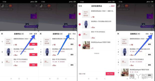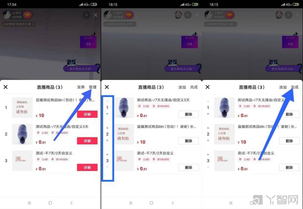 3、商品添加/删除/排序 商品添加/删除功能还可用于配合直播间秒杀使用,目前[限时秒杀]功能仅限小店商品使用,其他第三方电商平台商品可通过商品添加/删除功能配合秒杀,操作举例:A商品在限定时间内秒杀,主播在活动开始前为将商品价格设置为秒杀价后,活动开始时添加到直播间购物车,活动结束时立即下架即可。 商品添加/删除/排序操作如下: · 添加商品:点击管理——添加——确认添加——完成