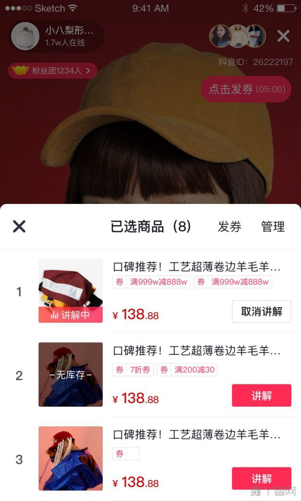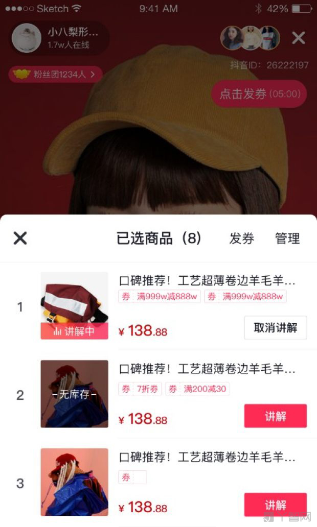 2.进入该商品的讲解时间,看播端弹出商品卡片(见下图1); 3.看播端点击购物袋,商品列表自动定位讲解商品,并增加UI动效(见下图4);