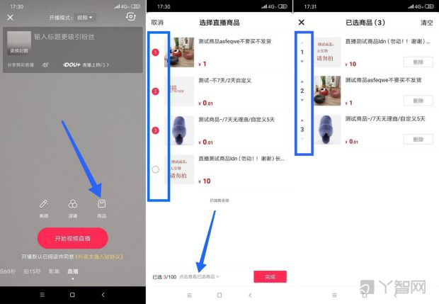 2、 添加商品 注意:直播分享的商品需提前添加到商品橱窗; 点击右边的“商品”进行选品 -- 勾选开播时要分享的商品; 点击查看已选商品--可对已选商品进行管理(排序、删除、清空)-- 完成 -- 开始直播;