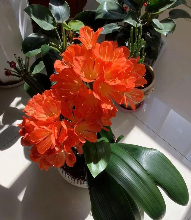 君子兰是石蒜科君子兰属的植物,原产于南非。君子兰是一种草本植物,叶片厚实,绿色,细长形,表皮翠绿,光泽度强,尤其是在阳光下,会散发着光芒,对称排列整齐,非常优雅漂亮。 而它的花朵又异常艳丽硕大,通常为黄色或橙色,花瓣有六瓣,花期是在冬季和春季,整体搭配起来,高雅且优美,豪华又大气,把它放置在桌面和窗台,能成为房间的装饰亮点。