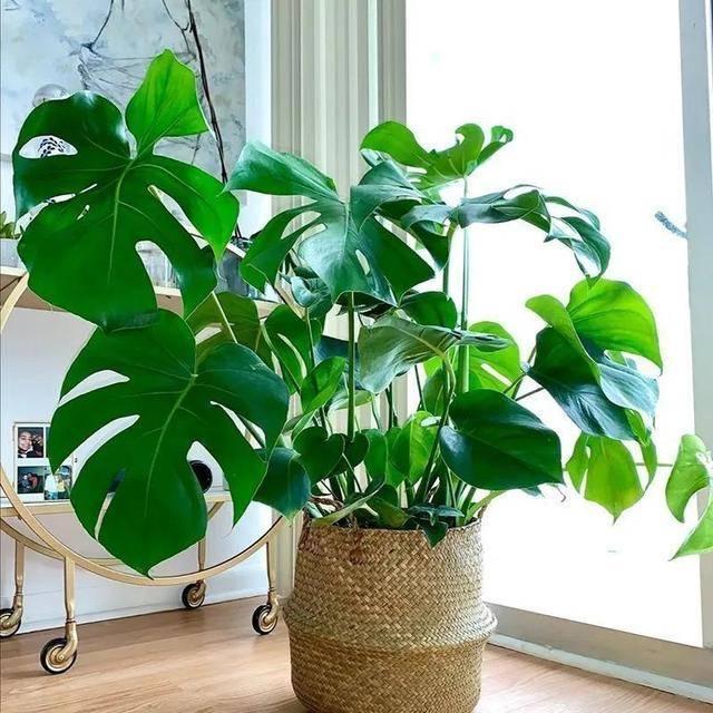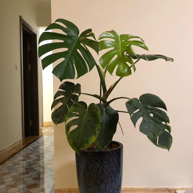3、龟背竹在客厅里,美观大方寓意好 龟背竹的叶子很大,叶子上有天然的裂纹,看起来就像是龟背上的花纹,树枝也是一节一节的,所以才有了龟背竹的名字,这是一种“长寿、健康、吉祥”的意思,它那特有的墨绿色,也让人觉得很有气势,枝叶伸展开来,美丽而飒。 从外观上来说,龟背竹要比发财树好看,并且还能吸收室内的甲醛、苯等有害气体,另外,龟背竹的叶子还具有很好的滞尘效果,还能吸附空气中的尘埃,如果家中种植龟背竹,定期对其大叶子进行清洗,以保持干净。