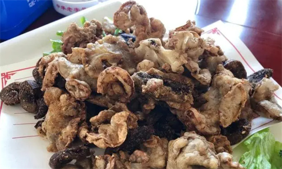 2. 东北炸三样 炸三样是一道美味的东北特色菜,包含鸡冠子油、猪连体和罗肌肉三种食材。经过炸制,它们变得香酥可口,是夜市小吃和下酒菜的热门选择。