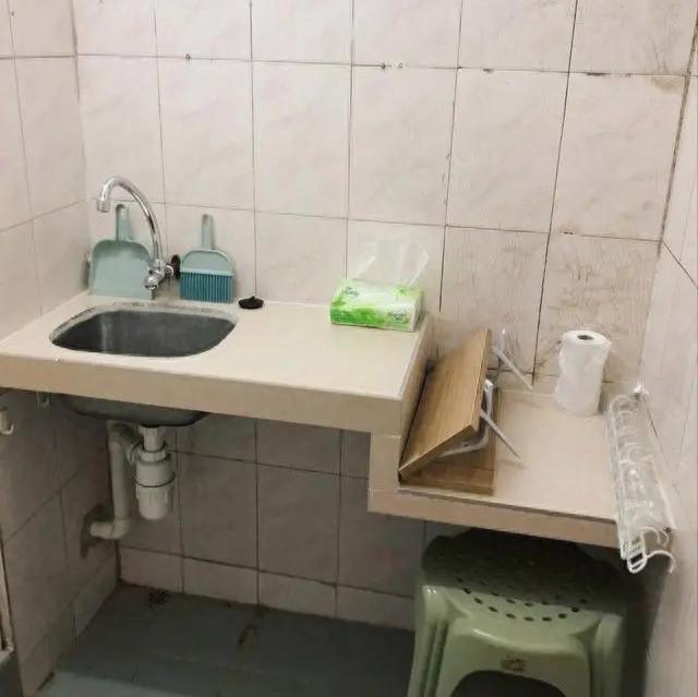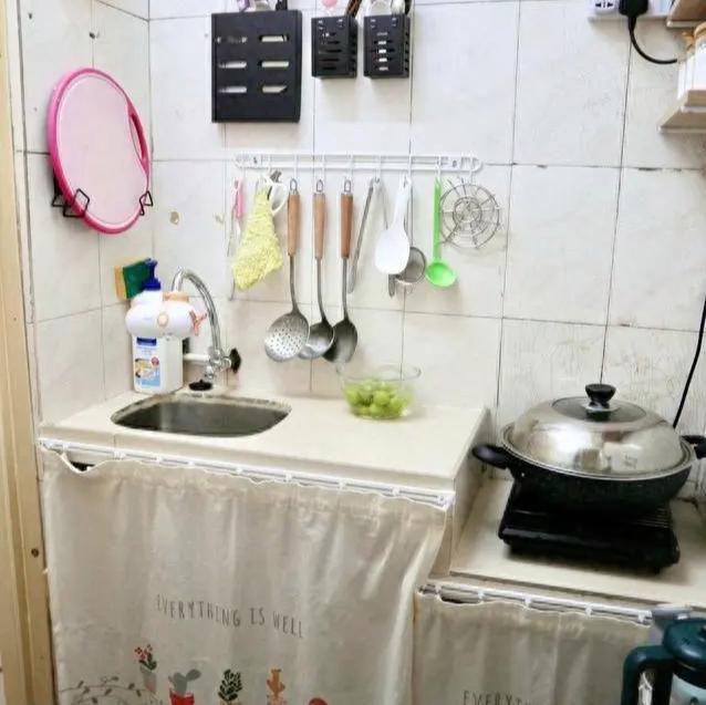 3、厨房 浮华世间的种种华美点缀,都比不上一碗简单的白米饭和粗茶淡饭,才是快乐的真谛。 就像汪增淇说的那样:“天下美食,皆在一碗饭里。”生命中最珍贵的瞬间,总是在一张热气腾腾的桌子上,留下了生命的温暖,留下了感情。 主人在狭小的空间里安排得如此巧妙,真是让人叹为观止。他们巧妙地解决了狭窄的问题,把2平米的房间分成了两个区域,中间用一扇木质滑门隔开了厨房和卫生间。