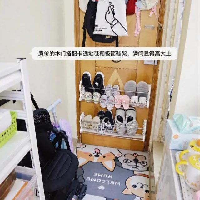 1、玄关 就算是小小的玄关,也可以被细心地装饰出趣味与功能的气氛,一进门,一张可爱的卡通地毯就热情地欢迎着主人的到来,它不仅仅承担着吸尘的作用,还为整个空间带来了一丝俏皮的颜色,像是一种欢快的问候。 门后有一个精巧的挂钩架子,承载着鞋子、包包等东西,鞋子整整齐齐地挂着,包包也放得很好,不浪费一点空间,这样的设计让墙壁的竖向空间得到了很好的解放,让玄关变得更加实用和干净。 每个角落都被精心策划,就连门口这一小块地方,都体现出创造性和实用性之间的完美平衡,给狭窄的空间增加了不少亮点。