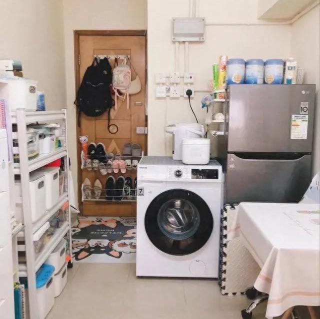 更何况,在洗衣机的台面上,还放着电饭煲、饮水机等生活用具,高效且精细,这一小块地方,充分体现了“智慧”与“组织性”。 收纳区右边则是由收纳架、书架、简易衣橱及置物架构成的多功能空间,构成一幅引人入胜的风景。 在收纳架上,巧妙地分隔开来,让各种物件分门别类,整齐且容易取得;