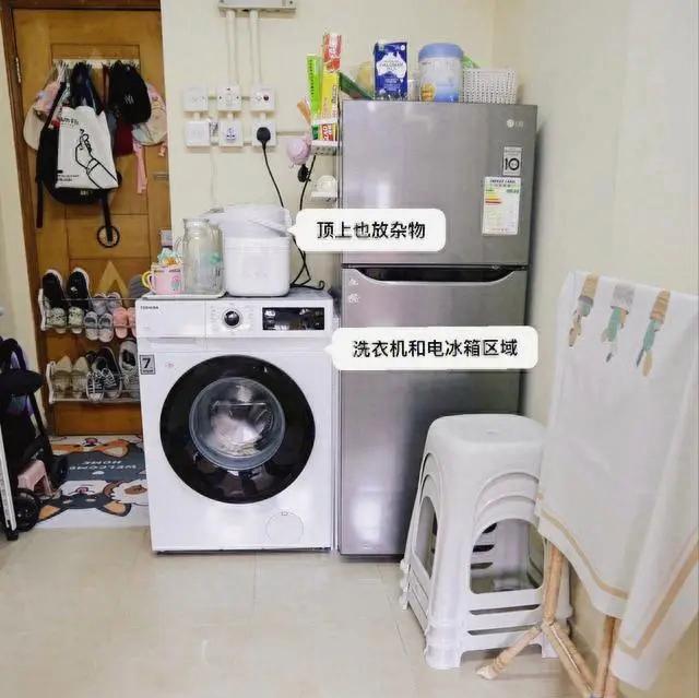 7、收纳区 在这个收纳的角落里,所有的东西都以精致与有序为主,带给人一种赏心悦目的感觉,家里的家电、家具、生活用具都被巧妙地集中在这里,虽然地方很小,但由于精心的安排,整体看起来井井有条,没有丝毫的局促与杂乱。 中央的墙壁上,是一台冰箱,一台洗衣机,右边是一个精巧的架子,将保鲜膜、垃圾袋、抹布之类的杂物都装了进去,既方便了生活,又增加了空间的美感。
