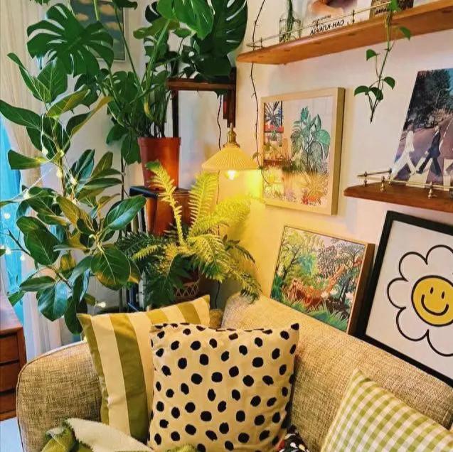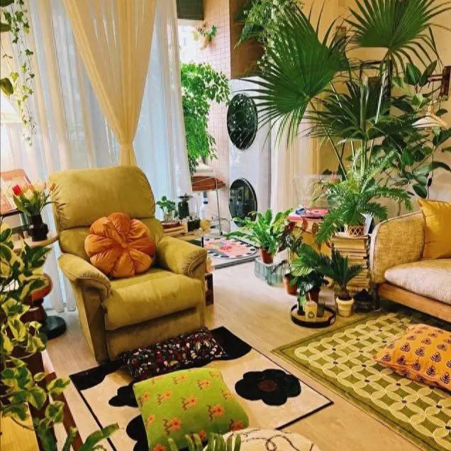 4、客厅 当然,这间客厅也是主人最爱的地方,每次进去,都能看到一片生机勃勃的景象,随意躺在哪里,都会觉得很舒服,很舒服; 原木色的选用为起居室增添了一种特殊的温暖质感,与周边的家具、花草构成协调的配色,原木色、暖色与植物的绿意交织在一起,营造出一种和谐的视觉感受。 起居室内的花草,并非单纯的摆设,而是与大自然融为一体,形成一幅和谐的画卷。这样的和谐,不但增加了空间的美感,也提高了装饰效果。