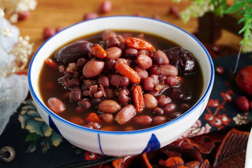 五红汤的做法食材: 红豆 红皮花生 红枣 枸杞 红糖 做法: 1、红豆和红皮花生提前浸泡4个小时,天气热可以放入冰箱冷藏室内浸泡,红豆和红皮花生比较硬,充分浸泡后煮起来更容易烂。 2、红枣洗净后去核,这样不会太上火。 3、把浸泡好的红豆和红皮花生清洗干净后和红枣,一块红糖放入砂锅中,加适量的水大火煮开后转小火煮30分钟,再焖10分钟,出锅前放入枸杞滚两滚即可。 |