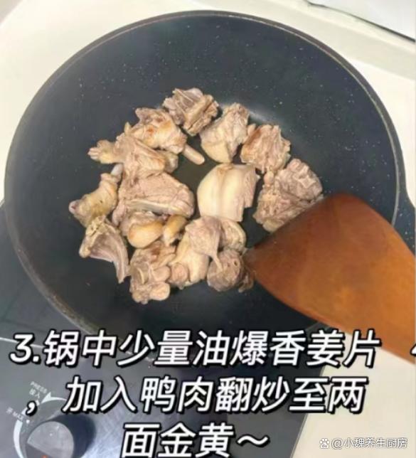 5:锅底提前预热一会儿,加上少许食用油,油温烧热之后,倒入焯水好的鸭肉,加上葱姜爆香,倒入鸭肉迅速煸炒,让鸭肉色泽变色。