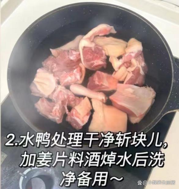 4:鸭肉放入汤锅里,放入葱段和姜片,加上冷水足量,没过鸭肉,将其炖煮一会儿,撇去一些浮沫,捞出用温水反复冲洗。