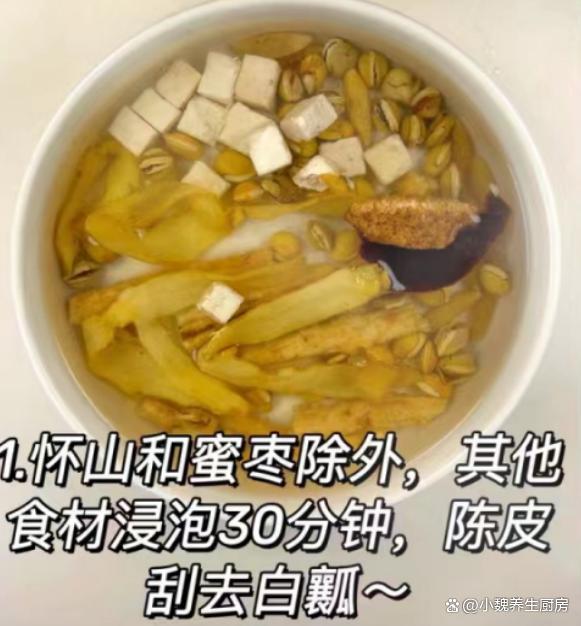 选购食材:选购蜜枣若干个,白扁豆一小把,陈皮15克左右,茯苓35克(也可以选择薏米,都能够赶走身体里的湿气,平常可以拿来炖汤喝,让你身体特别轻松),玉竹30克左右,干淮山药少许,800克水鸭(水鸭是用来炖鸭汤的首选,鸭肉肉质鲜嫩,鸭汤十分鲜美,秋季一定要多喝),白扁豆少许,生姜一大块,葱段少许,足量纯净水,冷水少许,几勺料酒,适量食盐,一丢丢胡椒粉,其他调味品。