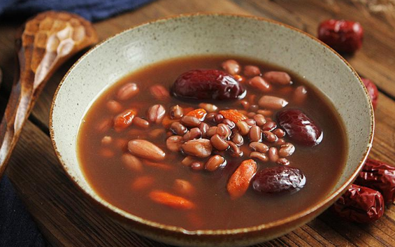 五红汤是在两餐之间喝吗可以在两餐之间喝,也可以在早晚喝。 五红汤的全名为五红补气养血汤,主要用枸杞、红豆、花生、红枣和红糖一起熬成的,具有补气养血、美容养颜等功效,可以一天喝两次,分成早晚是比较好的,但不建议天天喝,五红汤当中的营养价值比较丰富,若是长时间大量的喝,很有可能导致滋补过度。并且对于女性朋友来说,一般在*经期间以及产乳期是不建议服用五红汤的,而出现感冒等情况之后也不建议服用,*经期以及产乳期若是服用了五红汤,可能会导致*经量或恶露量增大,造成流血过多,而感冒期间服用滋补的五红汤,可能会导致病症加重。
