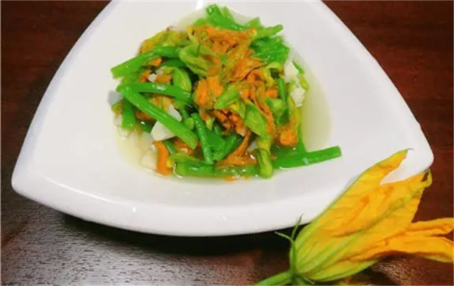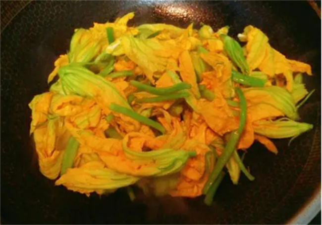 二、做法: 1,将南瓜花洗净,放入盐水中浸泡20分钟,然后将花朵撕成两半,去掉花茎的皮并折断。 2,取一锅,加入猪油,先放入蒜瓣炒香,大约10秒钟后, 3,接着放入南瓜花,一起翻炒2分钟,加入少许蚝油和盐,均匀翻炒后即可出锅。
