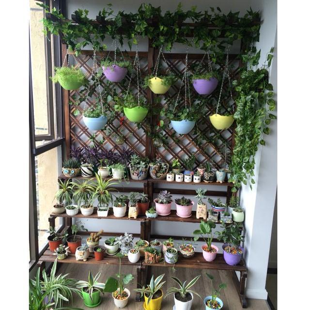 2、如果你不想做一个植物角落,只是想要将花瓶整齐地摆放在那里,那也是可以的,可以用花架将盆景整齐地摆放在一起,还可以为自己腾出一个休息的地方。花架也是有很多种的,木头、铁、竹等,款式、尺寸都可以按照自己的喜好来选择。 然后,在架子上面放几盆大盆,下面放一盆小盆,这样空间和光线都能得到很好的利用,等花开了,那就是一个小花园。
