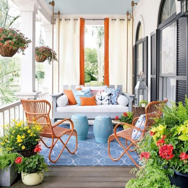 五、休憩的地方好不容易把阳台上的花草都种完了,总要有个合适的地方让大家休息一下,否则这露台花园也太浪费了。 1、摆个沙发,看看书,聊聊天。 与家人相聚,置身于百花盛开的花园里,舒舒服服地躺在长沙发上,不必为风雨担忧,不必为烈日担忧,与心爱之人一同读书、交谈,该是多么惬意的一件事。即便是独自一人,也能享受到属于自己的时光。