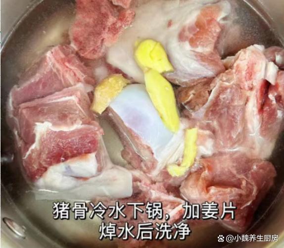 5:提前将猪骨处理干净,猪骨用流水反复冲洗,准备一个汤锅,放入一些猪骨和姜片,加上足量的冷水,加上适量料酒,提前把猪骨焯水,然后洗净备用。